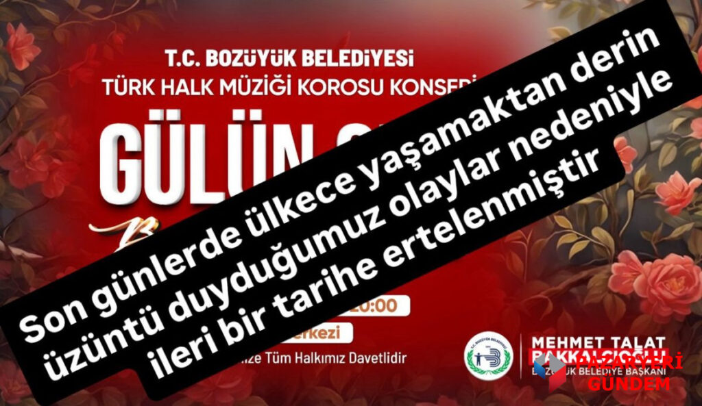 Bozüyük Belediyesi Türk Halk Müziği Korosu tarafından 18 Nisan 2026 Cumartesi günü gerçekleştirilmesi planlanan “Gülün Sesi, Bülbülün Türküsü” adlı konser programı, son günlerde ülke genelinde yaşanan ve derin üzüntüye neden olan gelişmeler sebebiyle ileri bir tarihe ertelendi.